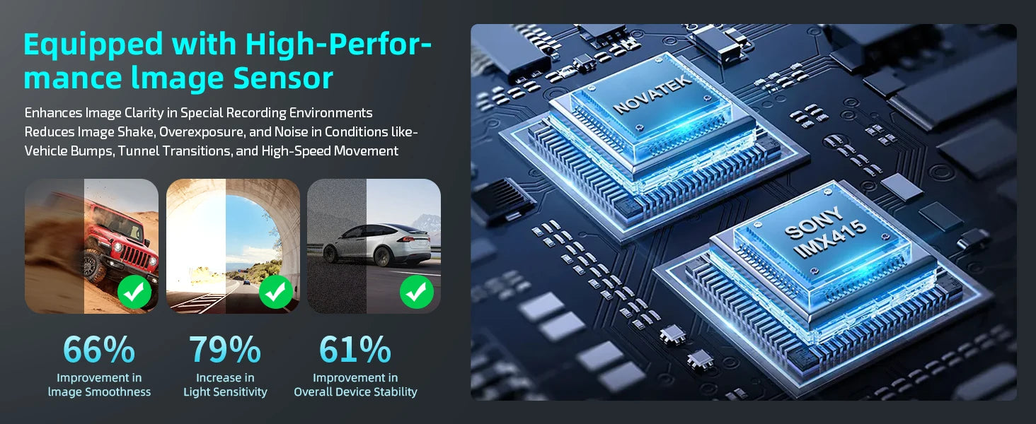 ▲ Funciones básicas: sensor G, grabación de bucle, monitoreo de estacionamiento, visualización de hora y fecha, amplio rango dinámico y función de encendido/apagado automático, etc.